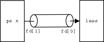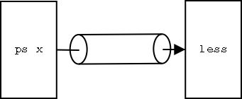 Anhand dieses Beispiels können sie sehen wie die Standardausgabe des Aufrufs ps x durch ein Pipe an less weitergeleitet wird. less verfährt dann weiter wie gewohnt.