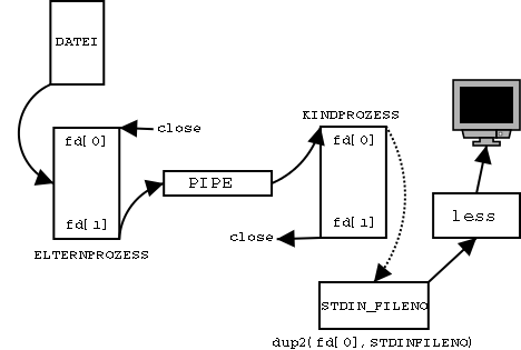 Im ersten Kapitel zu Pipe haben wir ein Programm geschrieben das aus einer Datei im Kindprozess gelesen hat. Dies gelesene haben wir dann in die Pipe geschrieben und der Elternprozess hat dies dann ausgelesen und wir haben es dann an die Standardausgabe auf dem Bildschirm weitergeleitet. Bei etwas längeren Texten zum Ausgeben war dies etwas unpassend, da der ganze Text auf einmal Ausgegeben wurde so das wir nicht sehen konnten was am Anfang des Textes stand. Nun könnte man natürlich hergehen und eine Funktion schreiben bei der wir alle 23 Zeilen aufgefordert werde ein Taste zu drücken damit wir die nächsten 23 Zeilen lesen können. Sicherlich es wäre ein gute Übung aber wozu das Rad wieder neu erfinden. Unix stellt uns dafür doch Funktionen wie z.B. less, pg, nl, tail, oder more zur Verfügung womit wir Zeilen - bzw. Seitenweise durch den Text blättern können. Wir wollen den Kindprozess mit dem Programm less überlagern.........