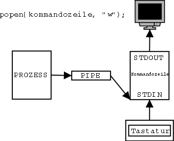 Prozess Lesen oder Schreiben wollen legen sie mit 'wie' fest. "r" steht für lesen aus der Pipe und "w" für Schreiben. Im Fehlerfall liefert uns popen NULL ansonsten den FILE-Zeiger zurück. Somit nimmt uns die Funktion popen folgende Arbeiten gegenüber der