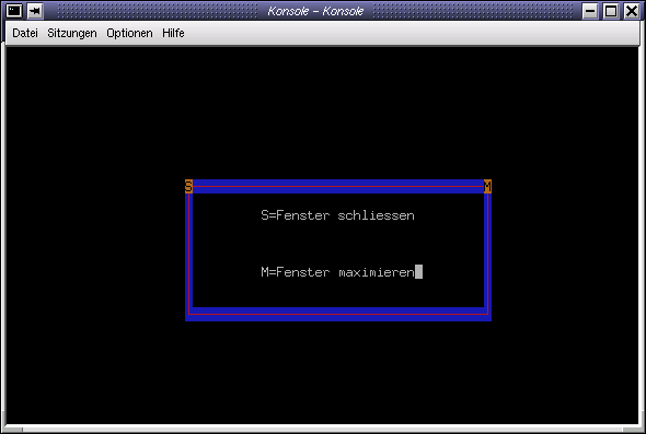 Ausgangspunkt nehmen wir die linke obere Ecke. Weiterhin habe ich an der linken oberen Ecke den Buchstaben 'S' und an der rechten oberen Ecke den Buchstaben 'M' an die Fensterecken gesetzt. Mit 'S' für Schließen schließen wir das Fenster. Mit 'M' Maximieren wir das Fenster *fenster. Erneutes Klicken auf 'M' bewirkt wieder das Minimieren zur normalen Größe des Fensters............