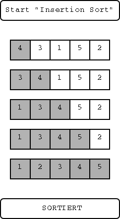 Insertion Sort ( = sortieren durch direktes Einfügen ) funktioniert folgendermaßen :