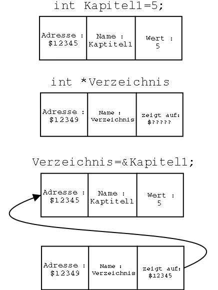 Variablen bei der Initialisierung zeigen und die unter Tabelle soll die Adressübergabe (Verzeichnis=&Kapitel1) demonstrieren. Doch halt was haben wir den hier? Wieso steht in dem Pointer nicht, wie wahrscheinlich vermutet der Wert 5, sondern die Adresse von der