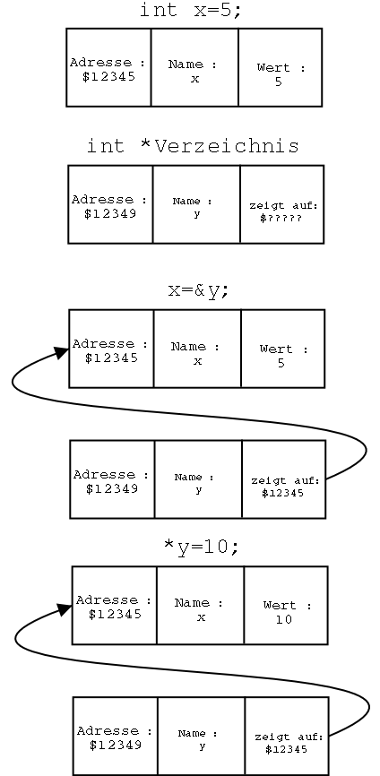 funktioniert? Nun Zeiger heißen auch nicht umsonst Zeiger. Unser Zeiger(*y) hat doch die Adresse von x bekommen (y=&x) und wir haben gelernt das wir mit unserem Dereferenzierungoperator '*' auf den Wert zeigen dessen Adresse unser Zeiger bekommen hat. Also hier der Verlauf.....