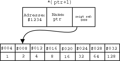 muss ptr+1 zwischen Klammern stehen. Das daher weil Klammern eine höhere Bindungskraft als der Dereferenzierungsoperator haben und somit zuerst ausgewertet wird. Sollten sie z.B. die Klammern vergessen, würden sie nicht auf die nächste Adresse zeigen, sondern den Wert auf den der Zeiger 'ptr' zeigt um eins erhöhen.