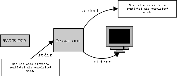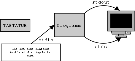 ...mit unserem Programm oben funktioniert. Mit dieser Umleitung wurde praktisch der "test.txt" in die Standarteingabe (stdin) umgeleitet. Hiermit könne sie keine Eingabe mehr von Tastatur machen. Und folge dessen leiten sie mittels...